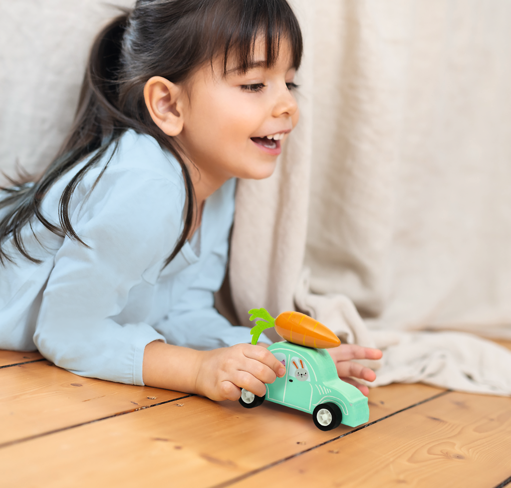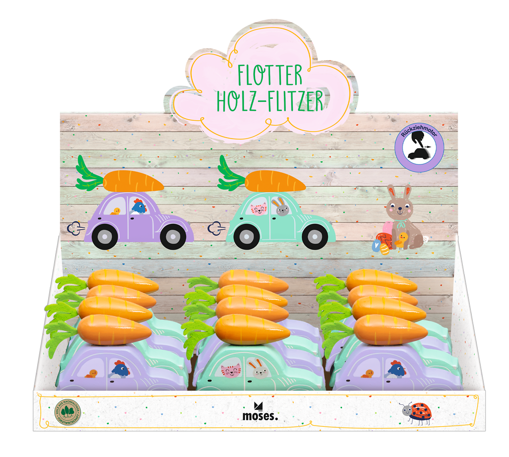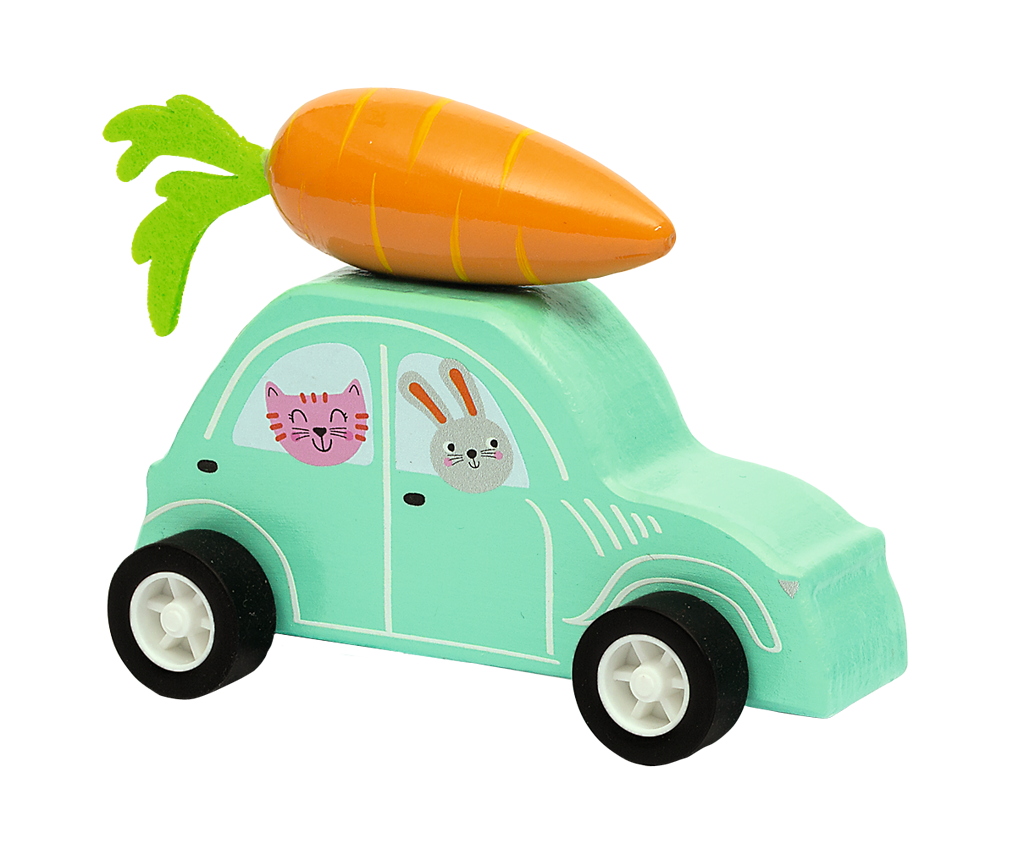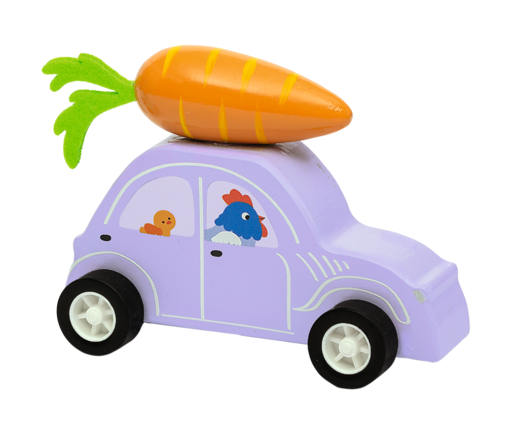 Racer med "dra-bak-motor"! Fin träbil med lustig morot på taket. Två färger.