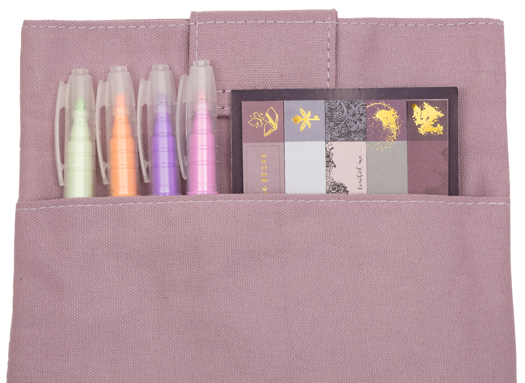 Skydda din bok i stil! Dessa bokfodral i 100 % bomull rymmer de flesta vanliga bokformat och har ett praktiskt extrafack på baksidan för pennor, stickers och bokmärken. Magnetstängning ger ett säkert och snyggt stäng. Handtvätt rekommenderas. Finns i 2 motiv: "Books" och "My Story". Storlek: ca 19,5 cm × 27,5 cm