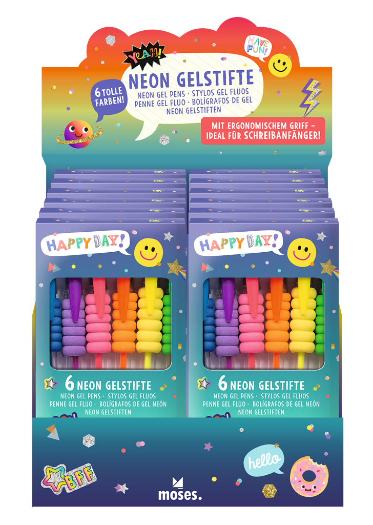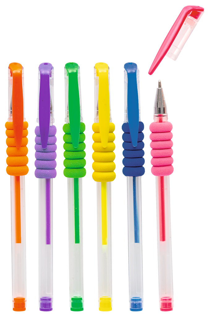Gelpennor i neonfärger. Ligger i ett 5-pack med olika färger. Gummerat håll för bättre grepp.