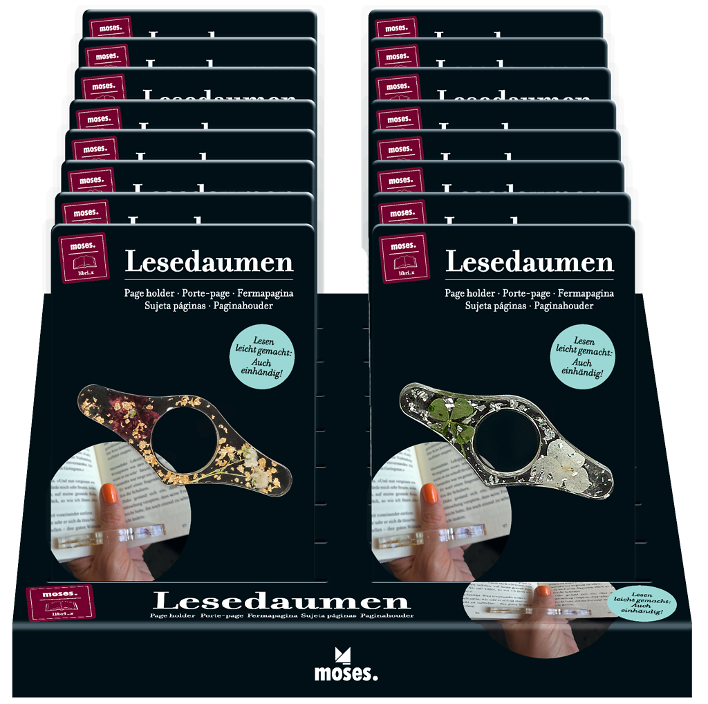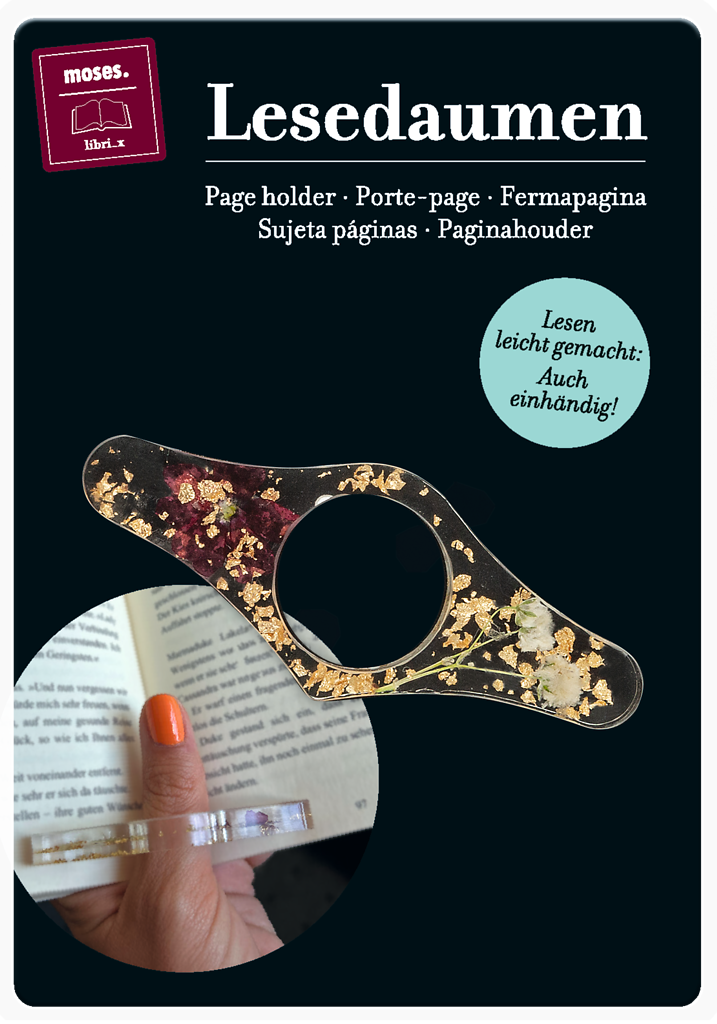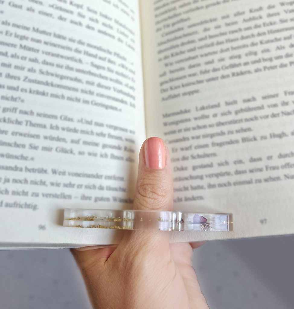 Sidhållare för boken du läser! Så praktisk! Nu kan du hålla boken med en hand och dricka te eller ta en chokladbit med den andra! Smidig liten hållare för tummen som underlättar att hålla bokuppslaget öppet. Små blommor och blad är ingjutna i hållaren.